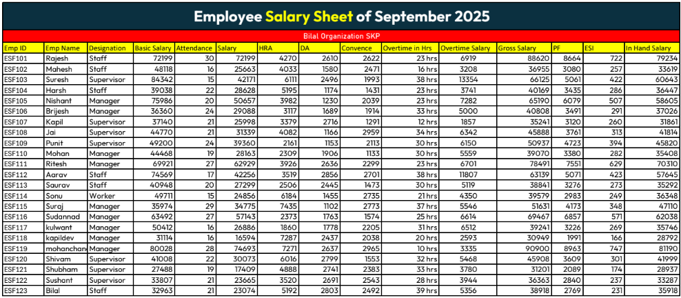 This Salary Sheet is a fully organized and automated Excel template designed to manage employee payroll smoothly. It includes fields such as Employee ID, Name, Designation, Basic Salary, H.R, D.A, P.A, P.S.I, Overtime, and Conveyance. The sheet accurately calculates total earnings and deductions to generate the final Hand Salary.