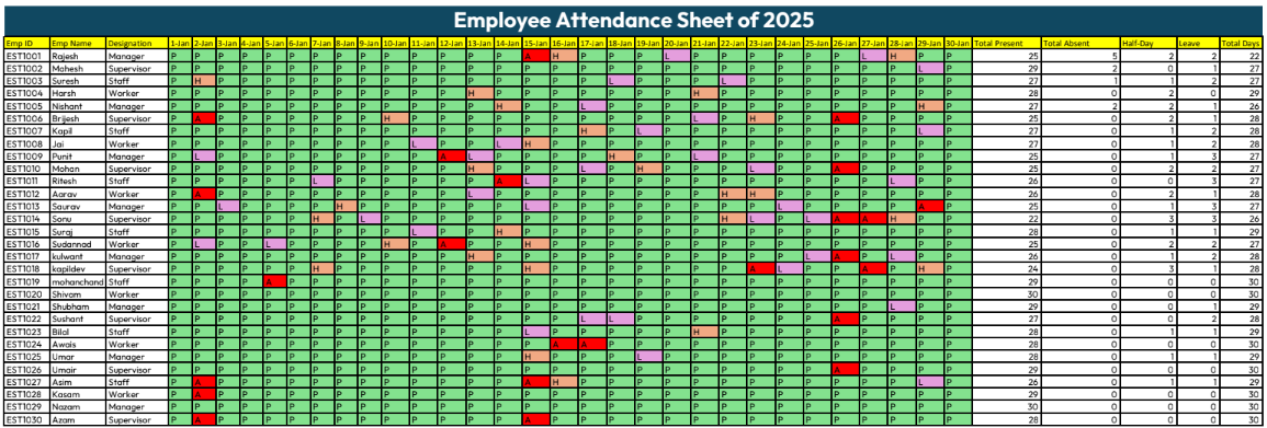 This Employee Attendance Sheet is a structured Excel template designed to track daily presence, absences, leaves, and overtime for all employees. It includes fields like Employee ID, Name, Date-wise Attendance, Total Present Days, Leaves, and Overtime Hours.